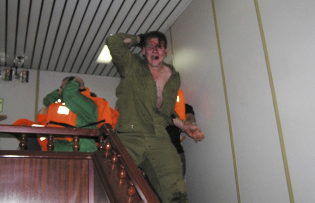 Our local horn blowing composer Phil Munger has posted a picture on his blog of one of the men of the IDF that boarded the Mavi Marmara . The picture shows the soldier standing at the top of a ladder on the boat with his right hand behind his head and the other hand being held by someone behind him.
